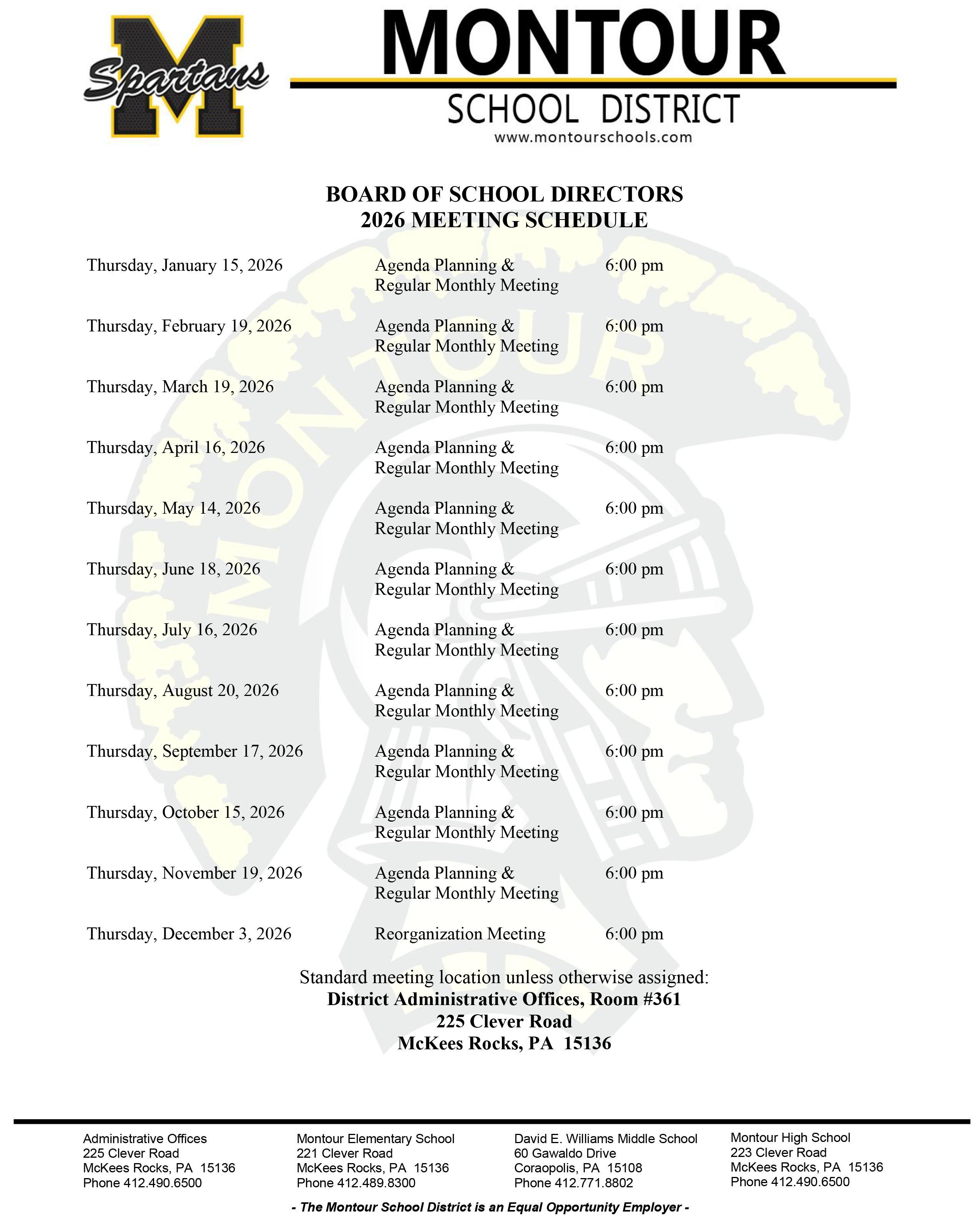 Meetings begin at 6:00 P.M. Any requests to address the Board are due by noon the day before the meeting. Anyone wishing to speak concluding the meeting can do so, only on matters that apply to the current meeting agenda and will be given a total of three minutes.